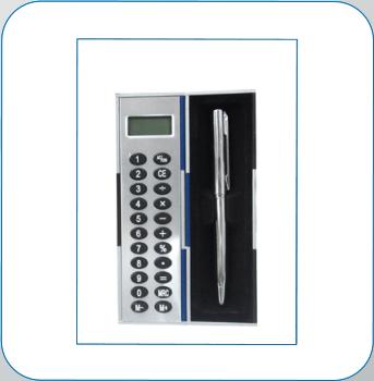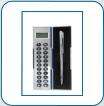 Calculadora de plástico com caneta.